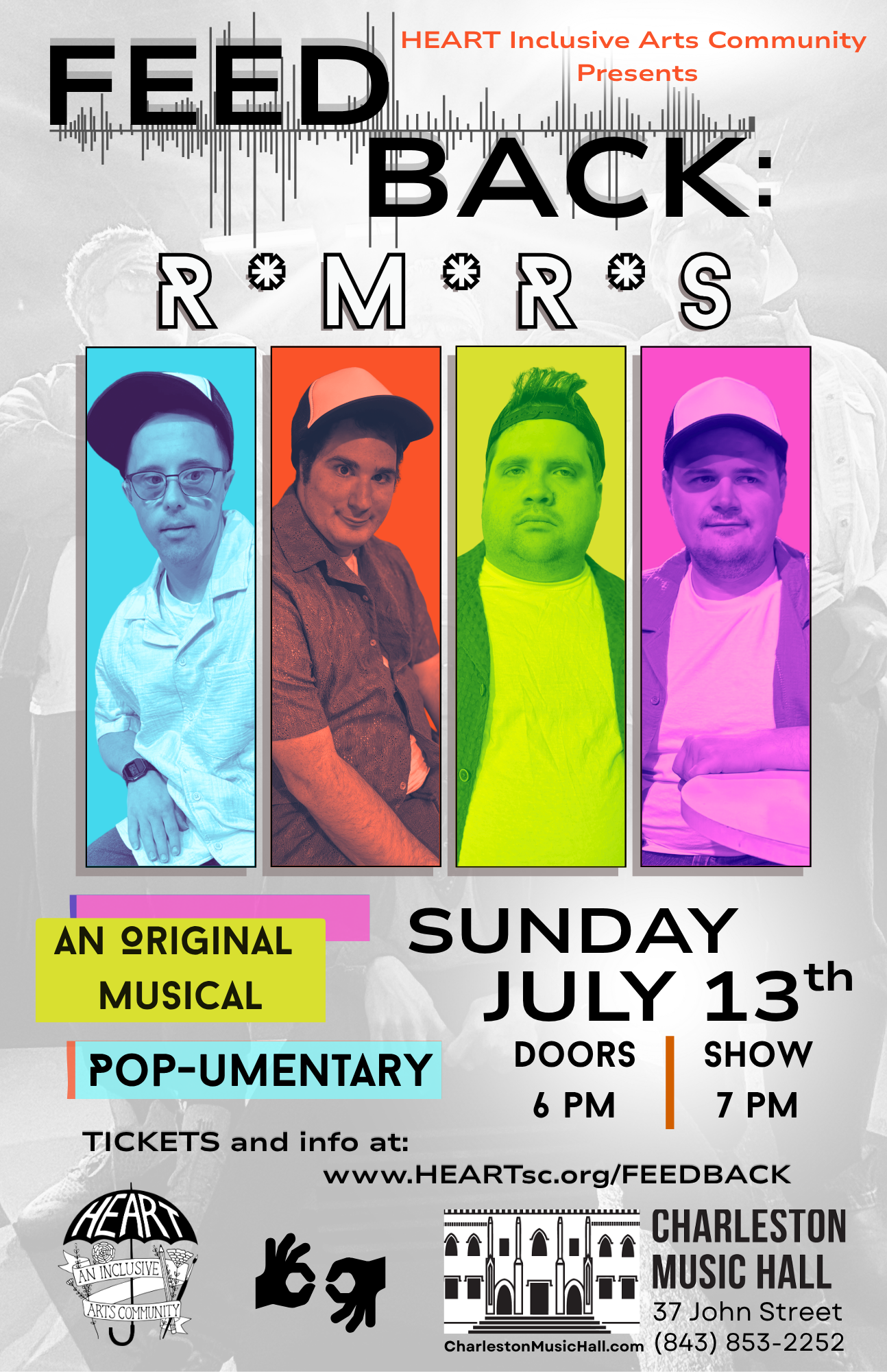We start with the question, “What kind of show do we want to see on stage?” and then we craft that show from the page up. Productions are supported by professional technicians, musicians, artists, and other creators. And we are proud to once again be performing on the iconic, historic boards of the Charleston Music Hall. All to present the highest caliber of production and promote the artistic growth of all the actors of the HEART Studio.