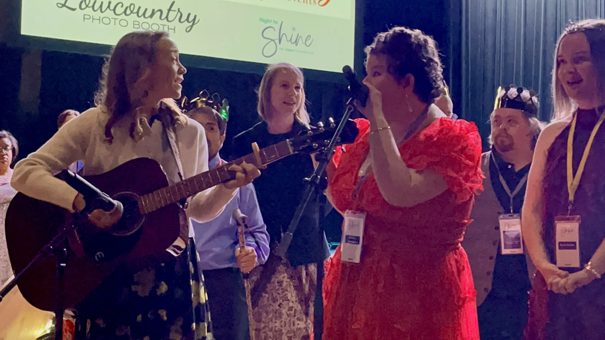 A group of performers stand behind microphones and sing in front of a stage. One woman plays an acoustic guitar and looks towards the rest of the performers.